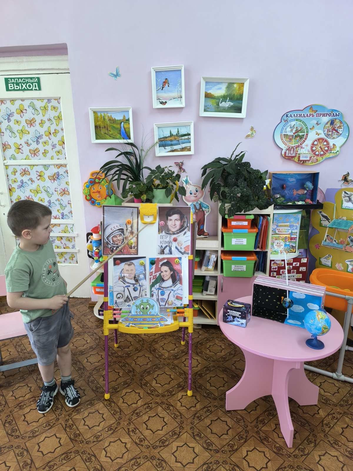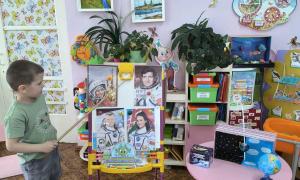 На занятии по образовательной области «Ребенок и общество» дети разновозрастной группы № 7 познакомились с историей освоения космоса и профессией космонавта через игровую деятельность. Ребята с увлечением участвовали в дидактических играх: раскладывали тематические карточки с изображением планет и ракет на полу и закрепляли картинки спутников и космических кораблей на магнитной доске. Особый интерес вызвала мини-презентация, гд