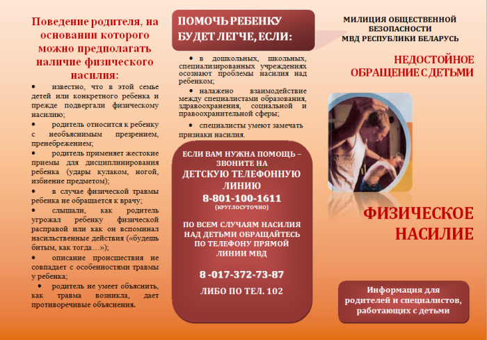 О фактах жестокого обращения с ребенком или насилия над ним можно сообщить в: сектор охраны детства (тел. 27401), СПЦ (тел. 25363), ИДН (тел. 55221).