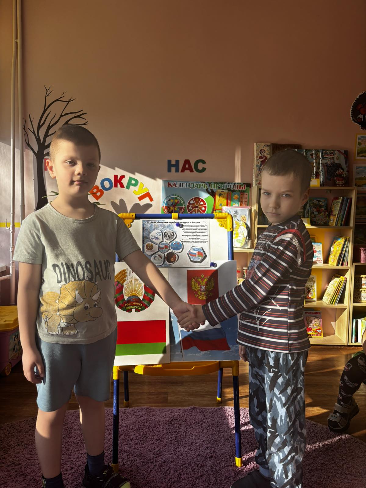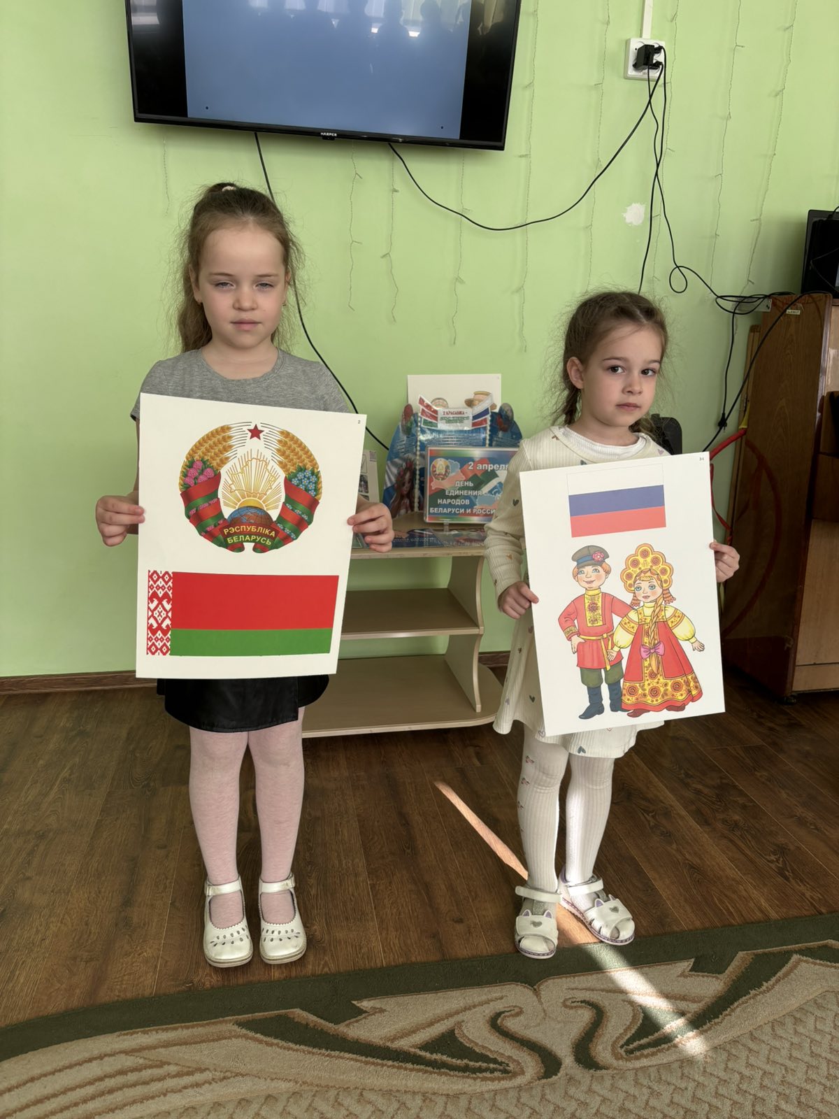 2 апреля в ГУО "Детский сад N5 г. Слонима" прошло развлечение, посвящённое Дню единения народов Беларуси и России. Мероприятие началось с исполнения гимна РБ, а также ребята прослушали гимн РФ. Ребята отправились в виртуальное путешествие, где смогли увидеть много общего у народов Беларуси и России. В ходе мероприятия состоялась познавательная беседа, приуроченная к Дню единения Республики Беларусь и России. Дошкольники узнали значение слова «единение» и поговорили о крепкой дружбе между братскими народами. Ребята активно участвовали в развлечении, танцуя зажигательные народные танцы «Лявониха» и «Барыня». Также дети проявили творчество и смастерили символичный венок из ромашек и васильков в честь единства наших стран. Развлечения закончилось хороводом дружбы.
