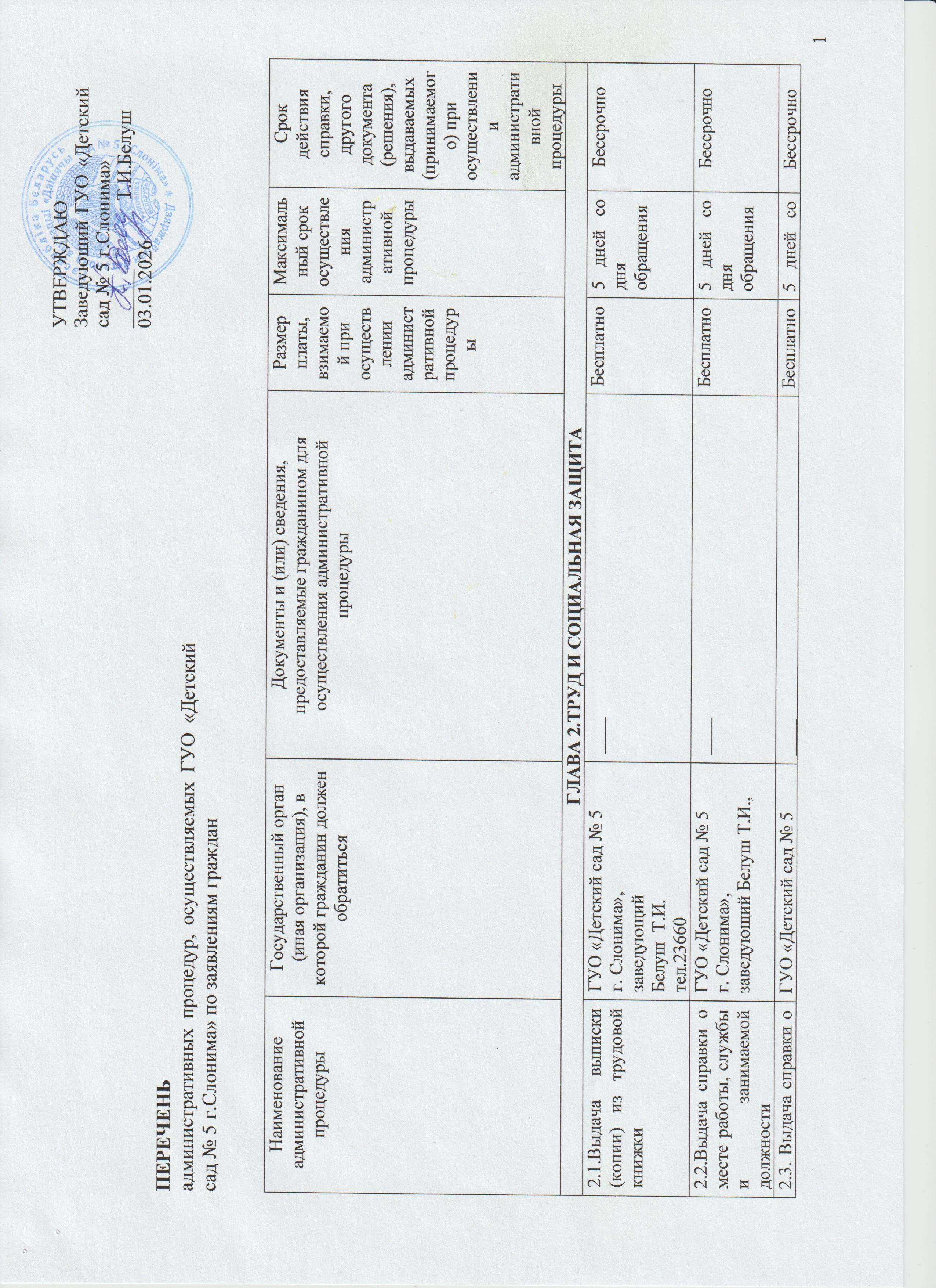 Прием граждан с заявлениями  о выдаче выписки (копии) из трудовой книжки,  справки о месте работы, службы и занимаемой должности,  справки о периоде работы, службы,  о выходе в отпуск по уходу за ребенком до достижений в возрасте 3 лет,   о том, что гражданин является воспитанником учреждения образования осуществляется  Белуш Тамарой Ивановной заведующим учреждением, кабинет заведующего, телефон 8 (01562) 23660.