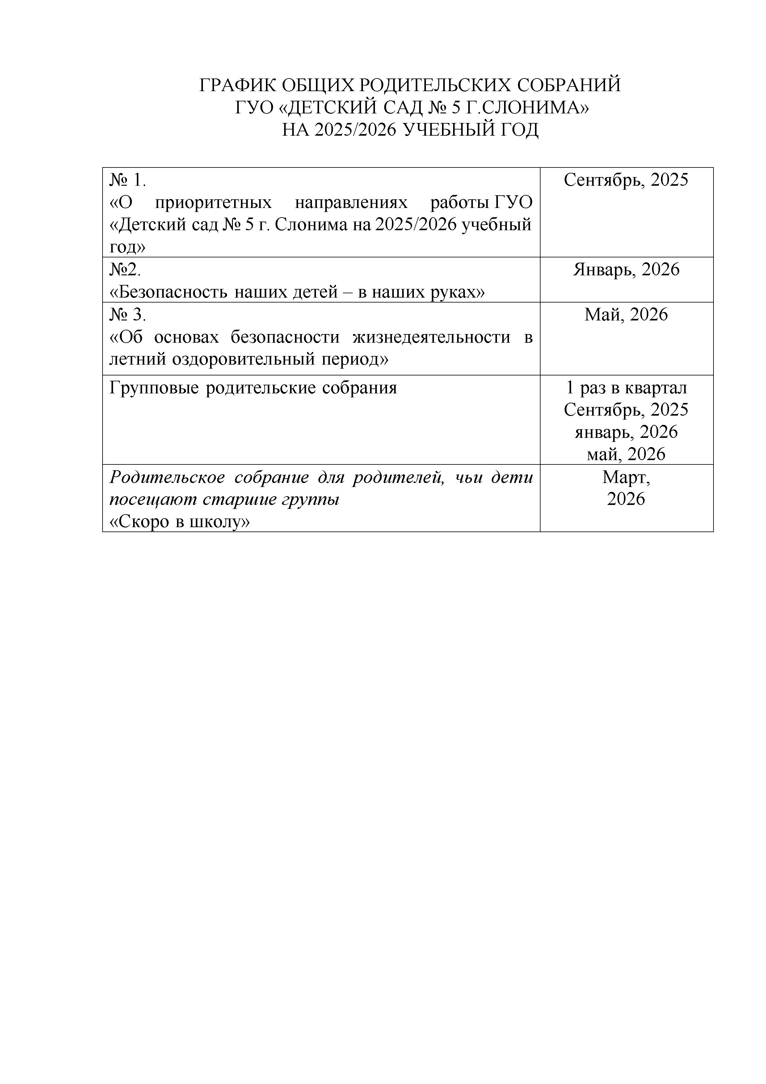 ГРАФИК ОБЩИХ РОДИТЕЛЬСКИХ СОБРАНИЙ НА УЧЕБНЫЙ ГОД